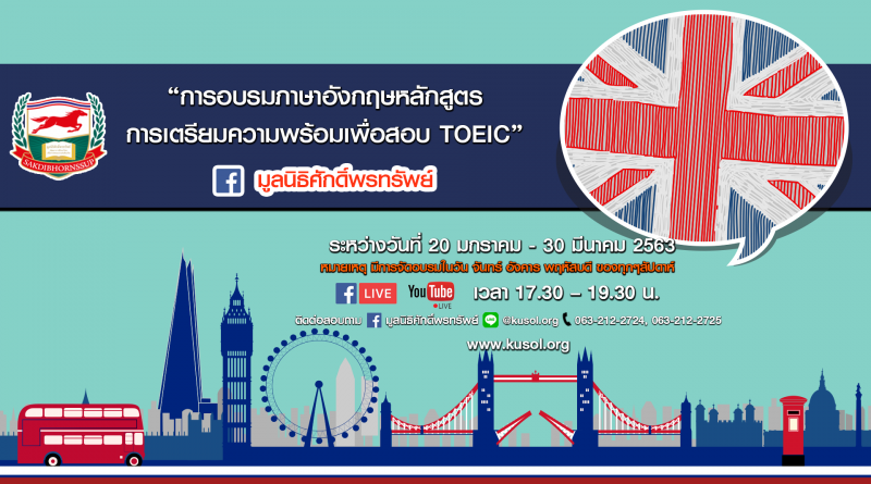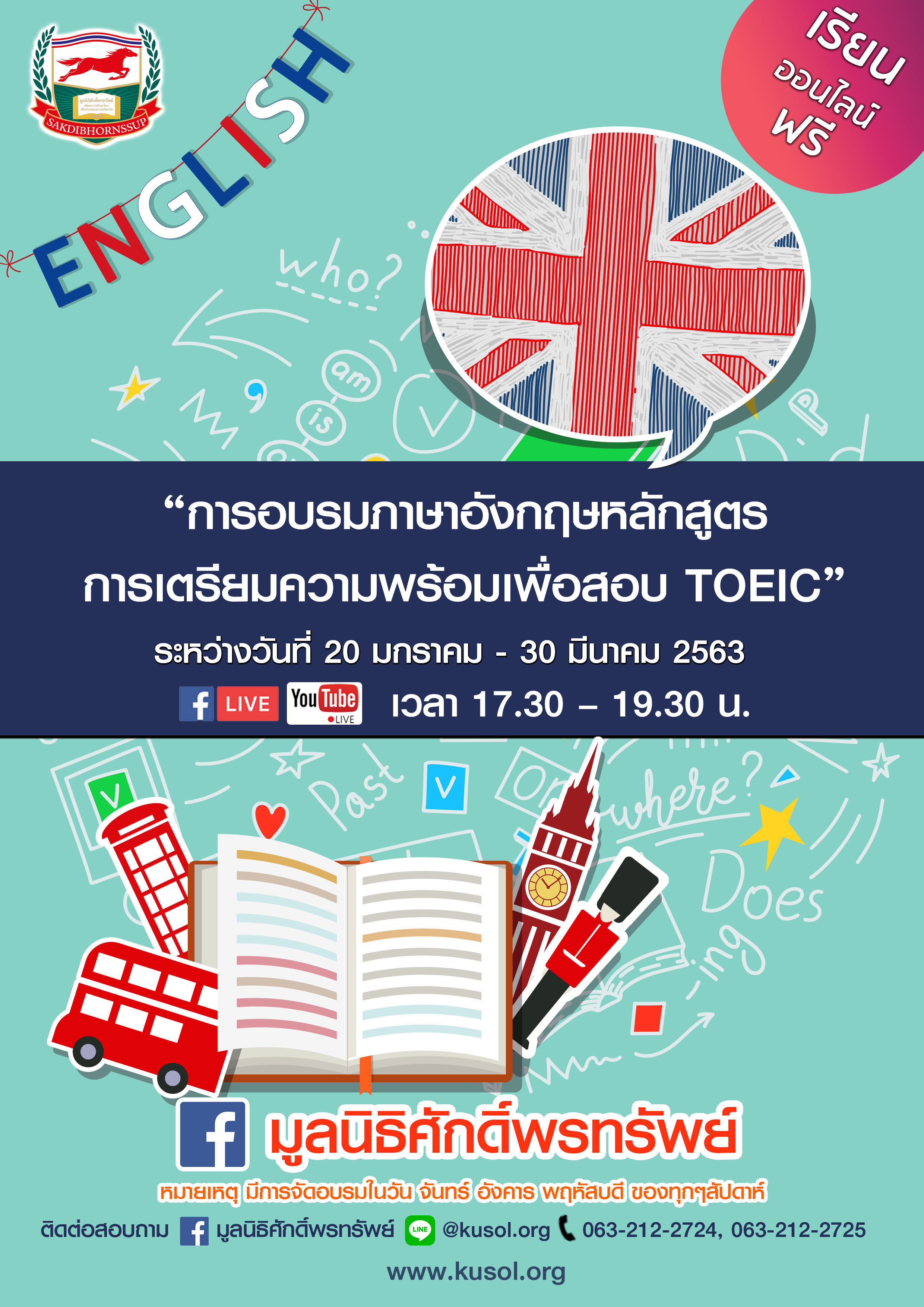 ข่าวประชาสัมพันธ์ “การอบรมภาษาอังกฤษหลักสูตร การเตรียมความพร้อมเพื่อสอบ TOEIC” January 20, 2020January 20, 2020 kusol admin รับชมผ่านช่องทาง youtube Live 👉👉คลิก เพจ facebook Live 👉👉 มูลนิธิศักดิ์พรทรัพย์