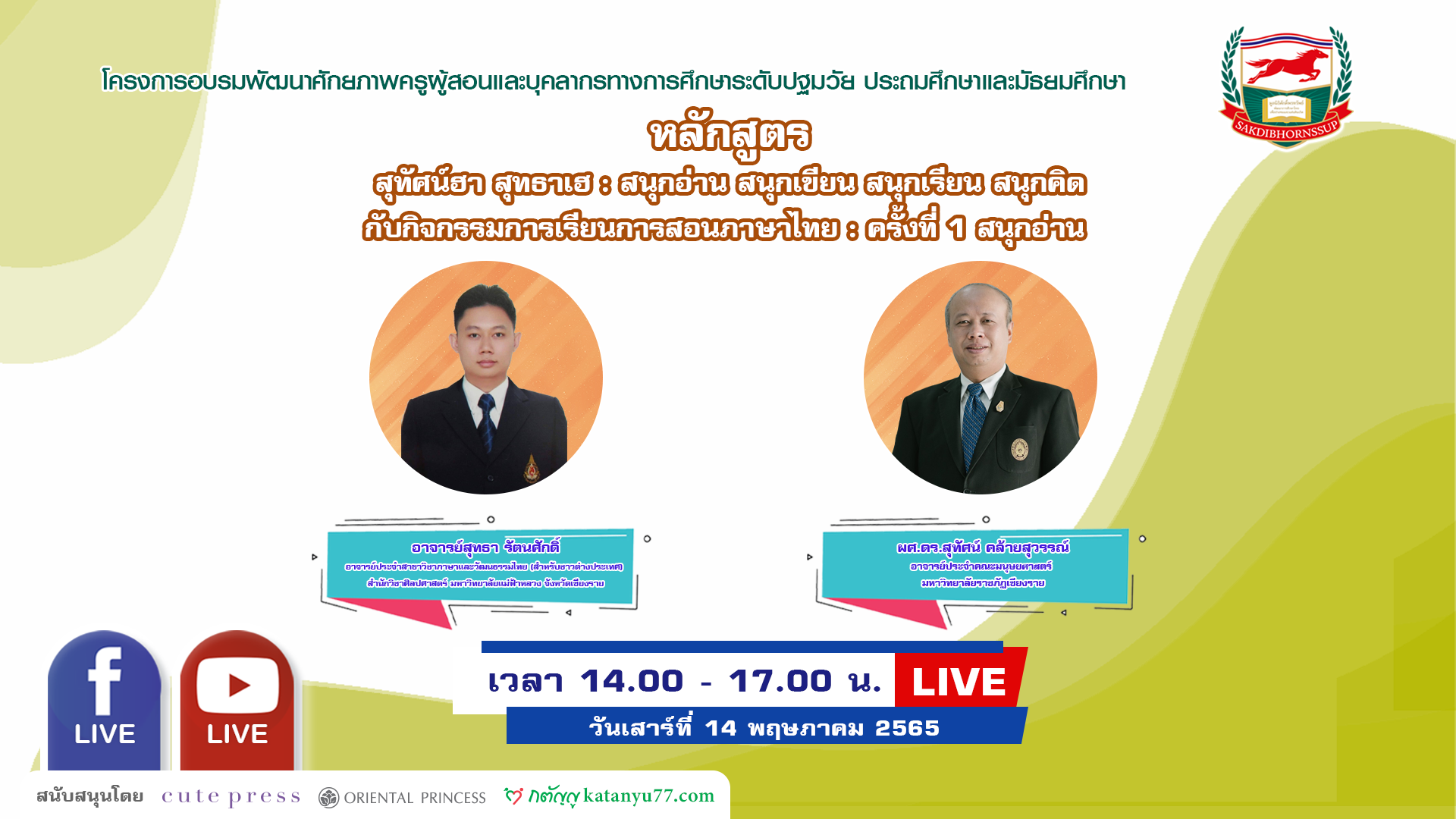 ประกาศรายชื่อผู้เข้าอบรมออนไลน์ : วันเสาร์ที่ 14 พฤษภาคม 2565 เวลา 14.00-17.00 น. วิทยากร : ผศ.ดร.สุทัศน์ คล้ายสุวรรณ์