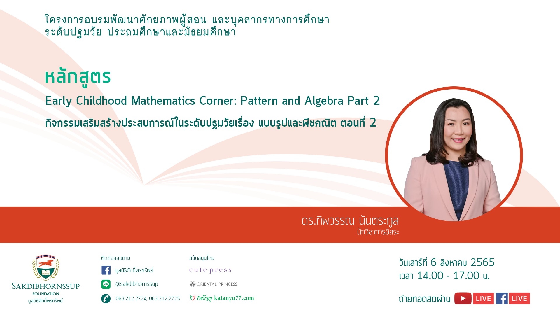ประกาศรายชื่อผู้เข้าอบรมออนไลน์ : วันเสาร์ที่ 6 สิงหาคม 2565 เวลา 14.00-17.00 น. วิทยากร : ดร.ทิพวรรณ นันตระกูล