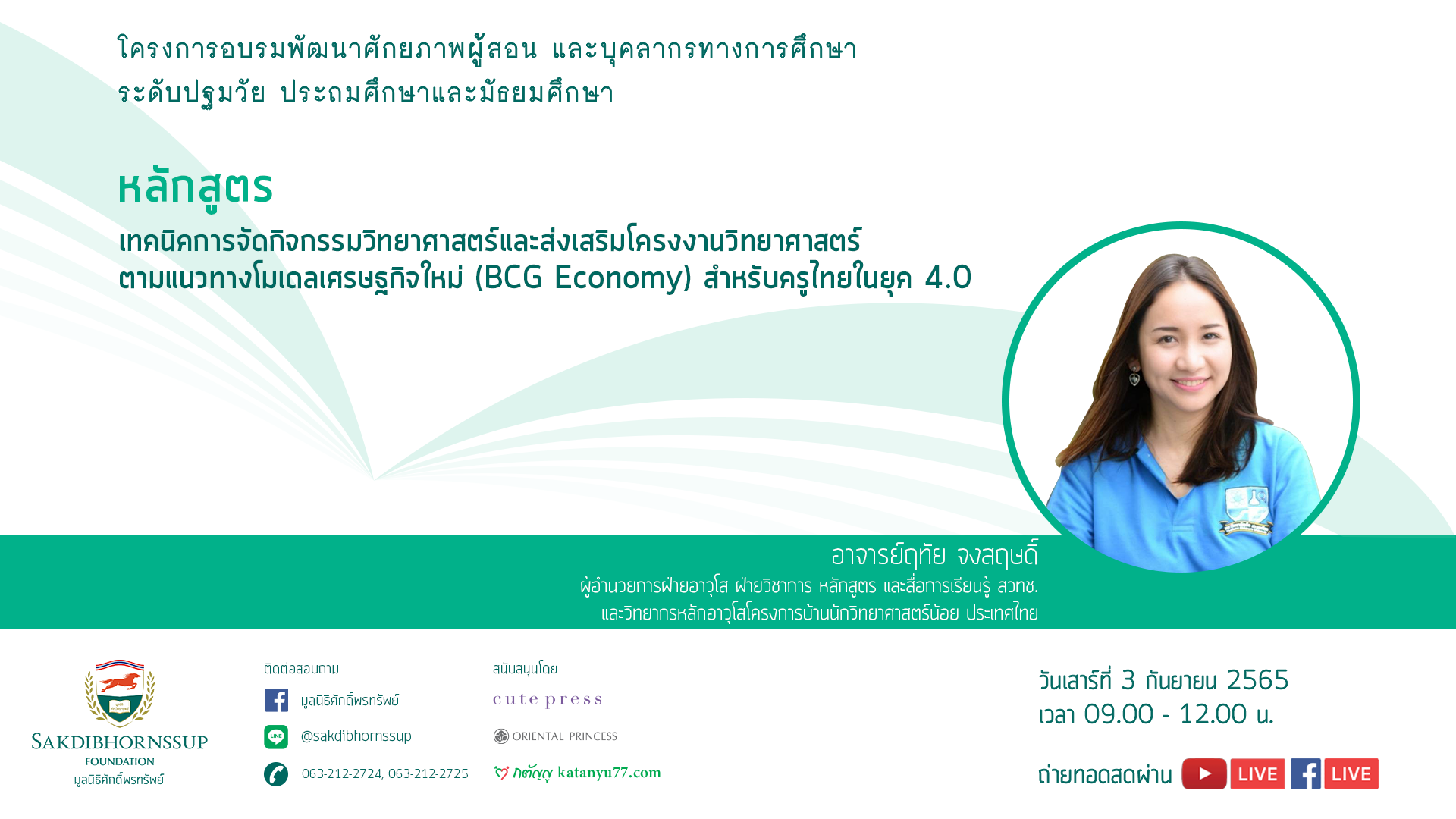 หลักสูตร : เทคนิคการจัดกิจกรรมวิทยาศาสตร์และส่งเสริมโครงงานวิทยาศาสตร์ตามแนวทางโมเดลเศรษฐกิจใหม่ (BCG Economy) สำหรับครูไทยในยุค 4.0