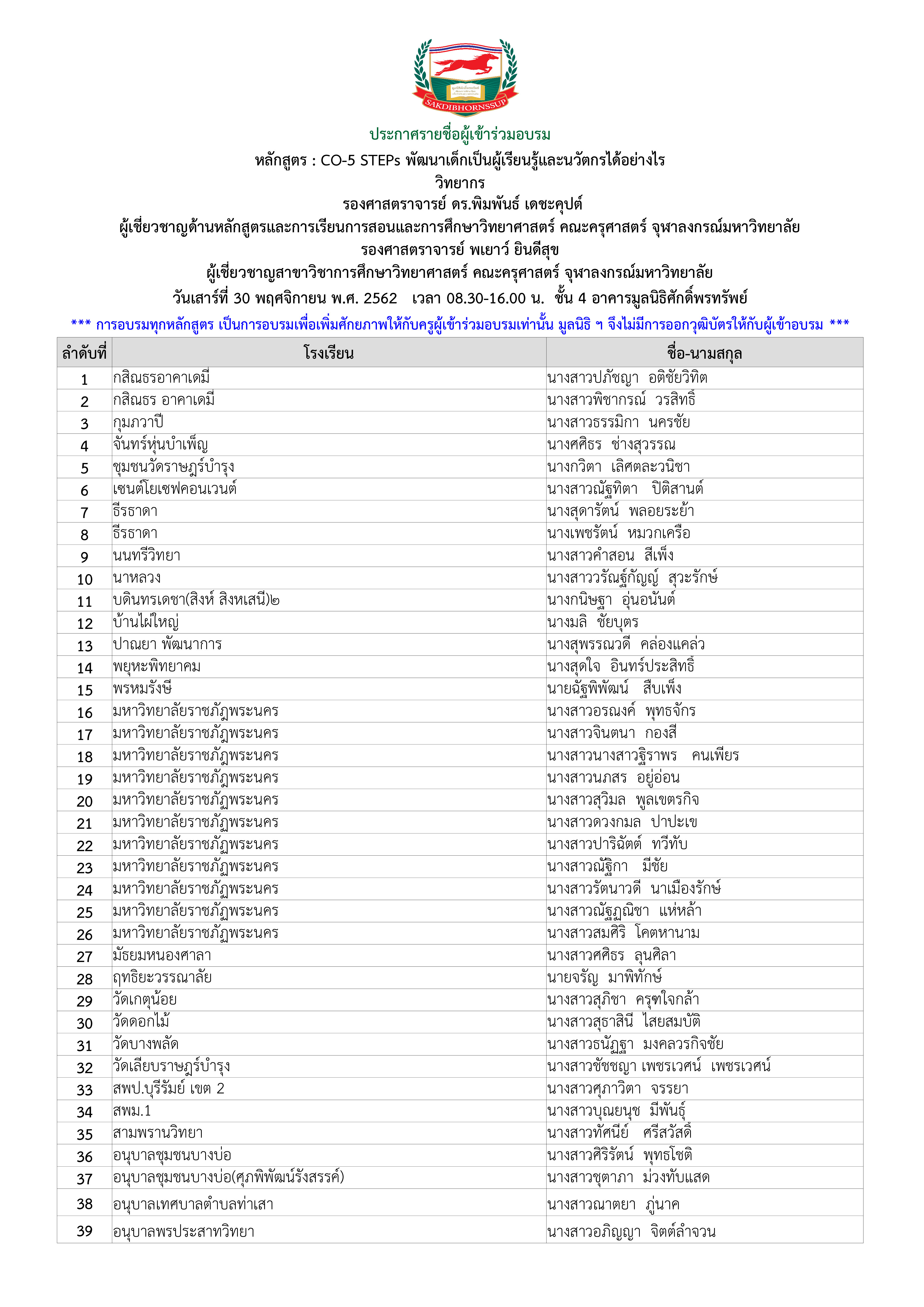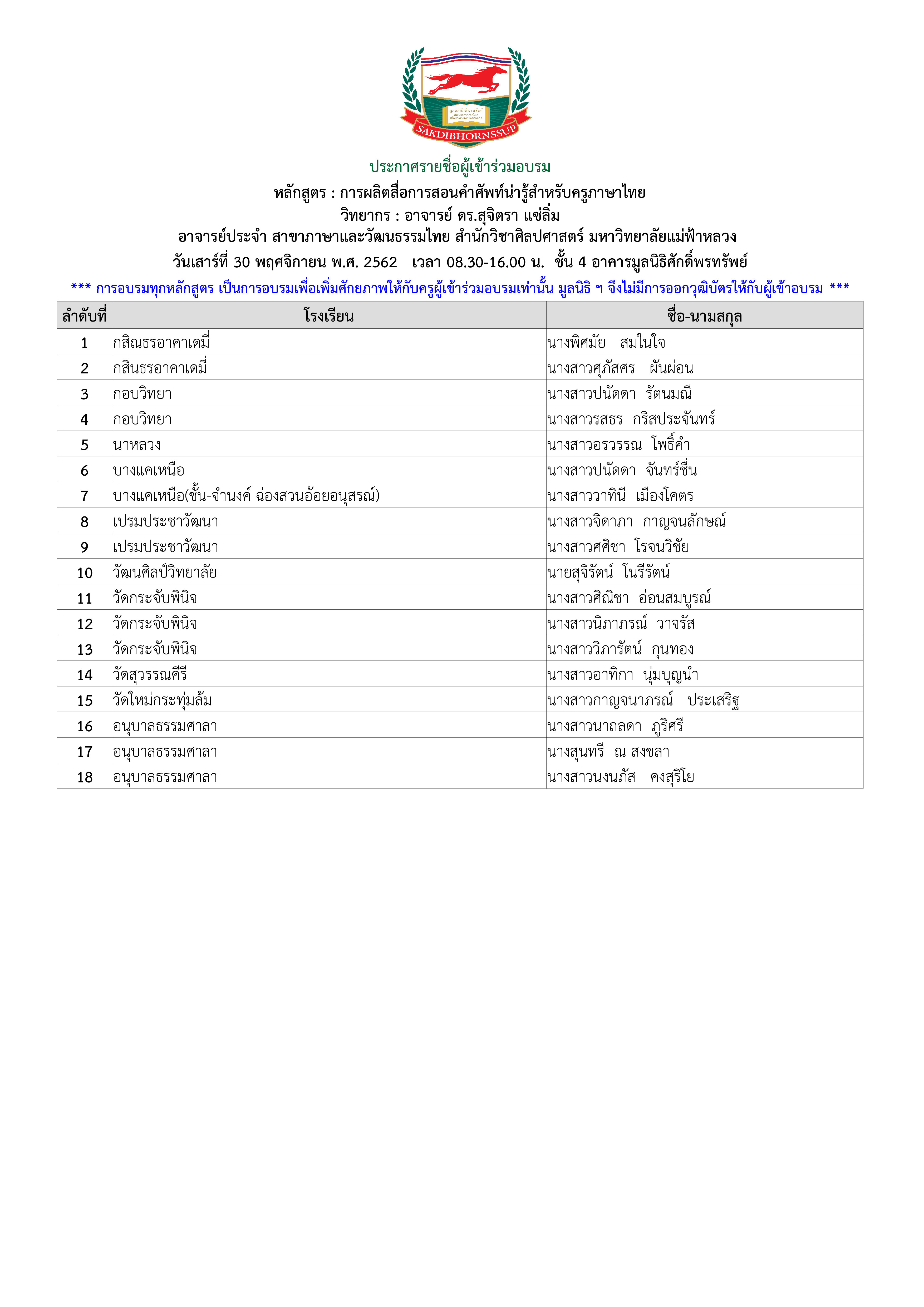 ประกาศรายชื่ออาจารย์ผู้เข้าอบรม : วันเสาร์ที่ 30 พ.ย. 62