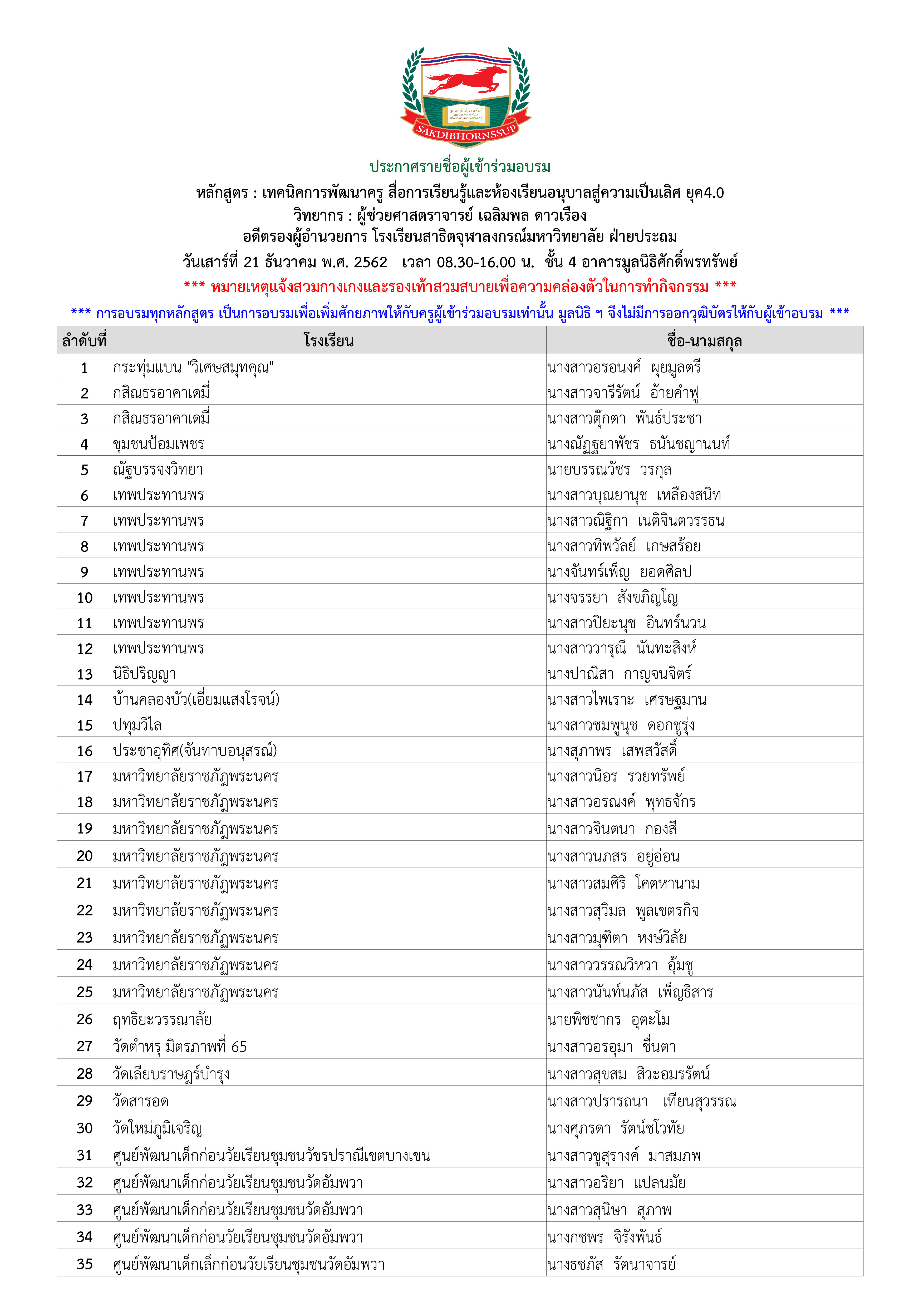 ประกาศรายชื่ออาจารย์ผู้เข้าอบรม : วันเสาร์ที่ 21 ธ.ค. 62