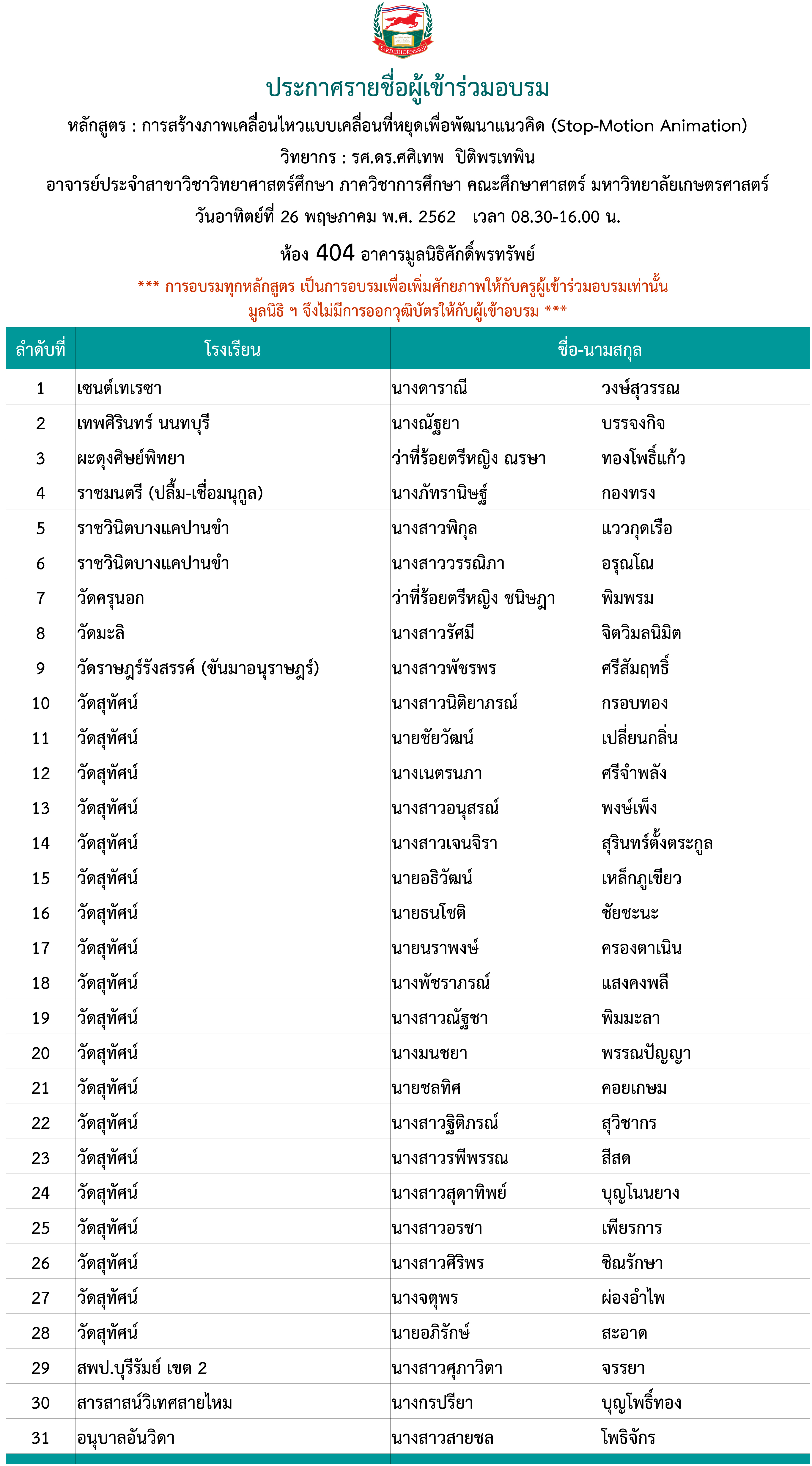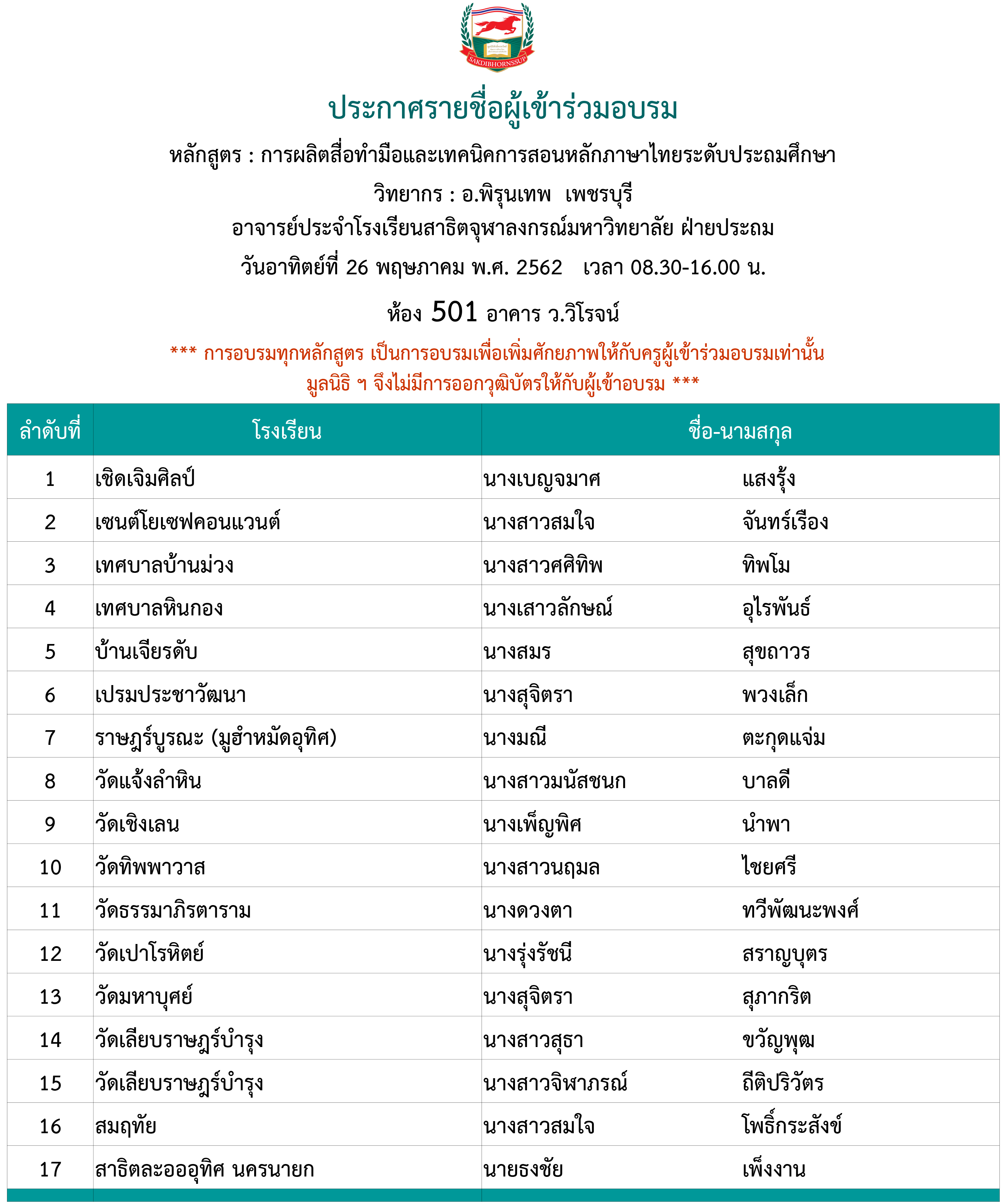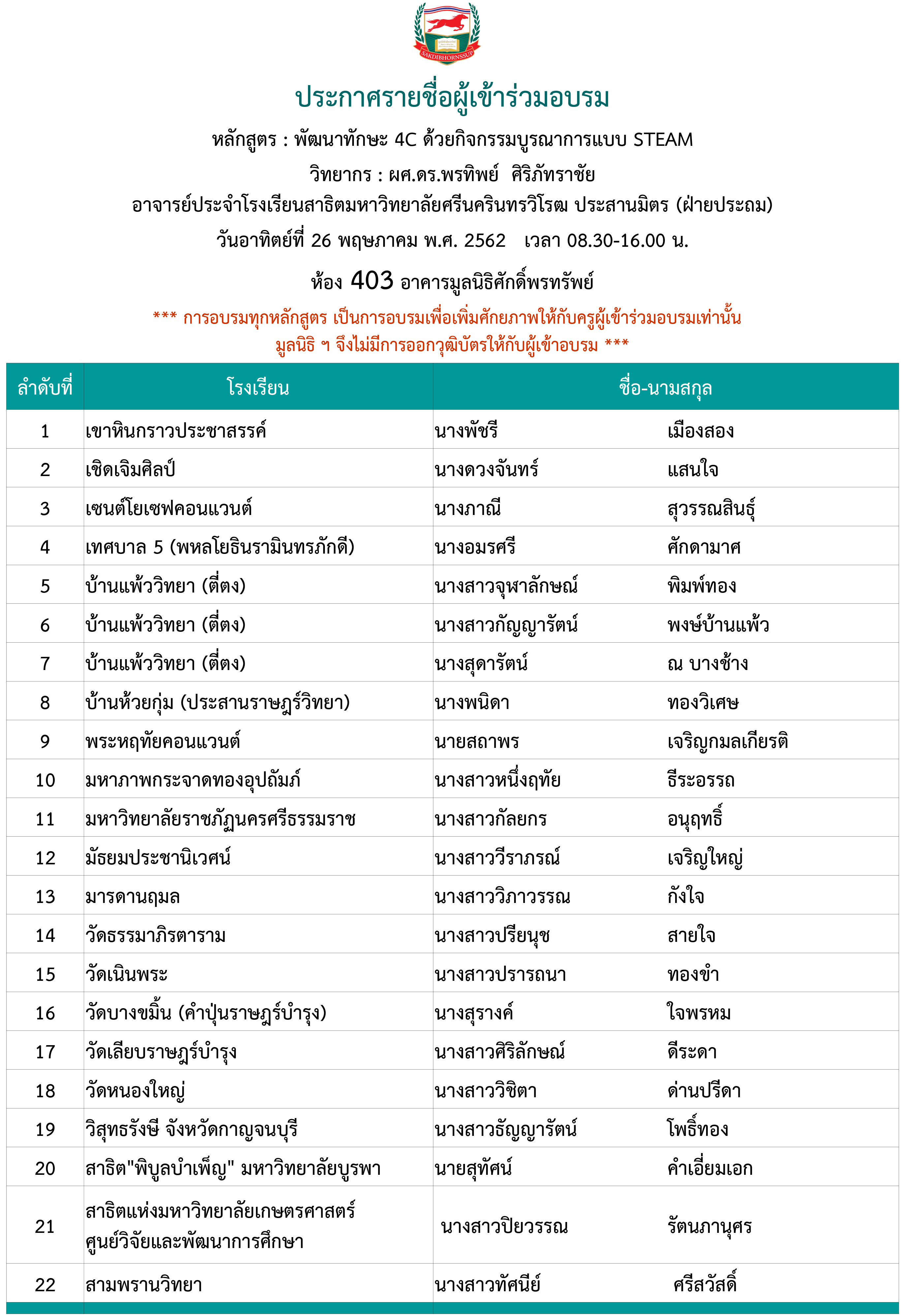 ประกาศรายชื่อ คณาจารย์ผู้เข้าร่วมอบรม วันที่ 25-26 พฤษภาคม 2562