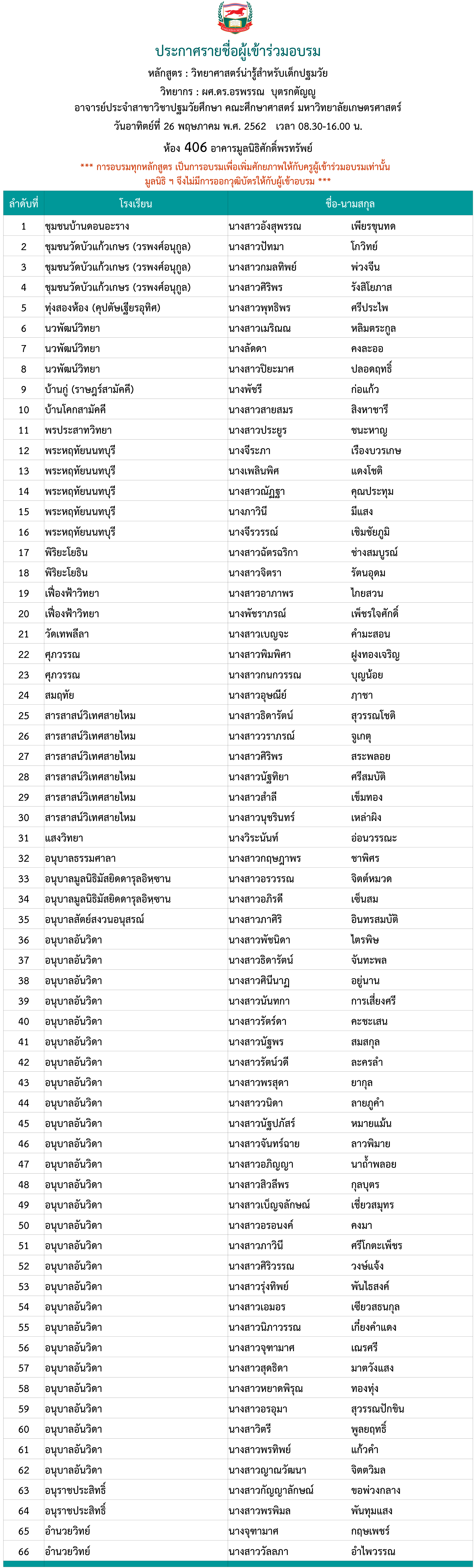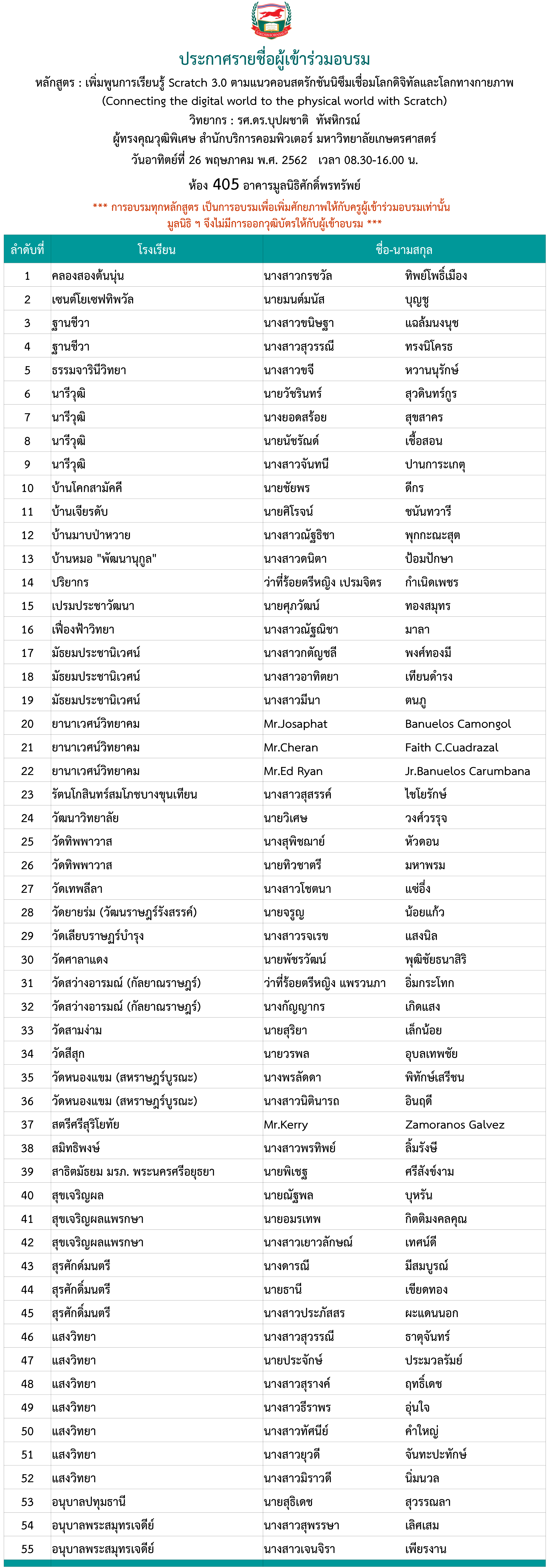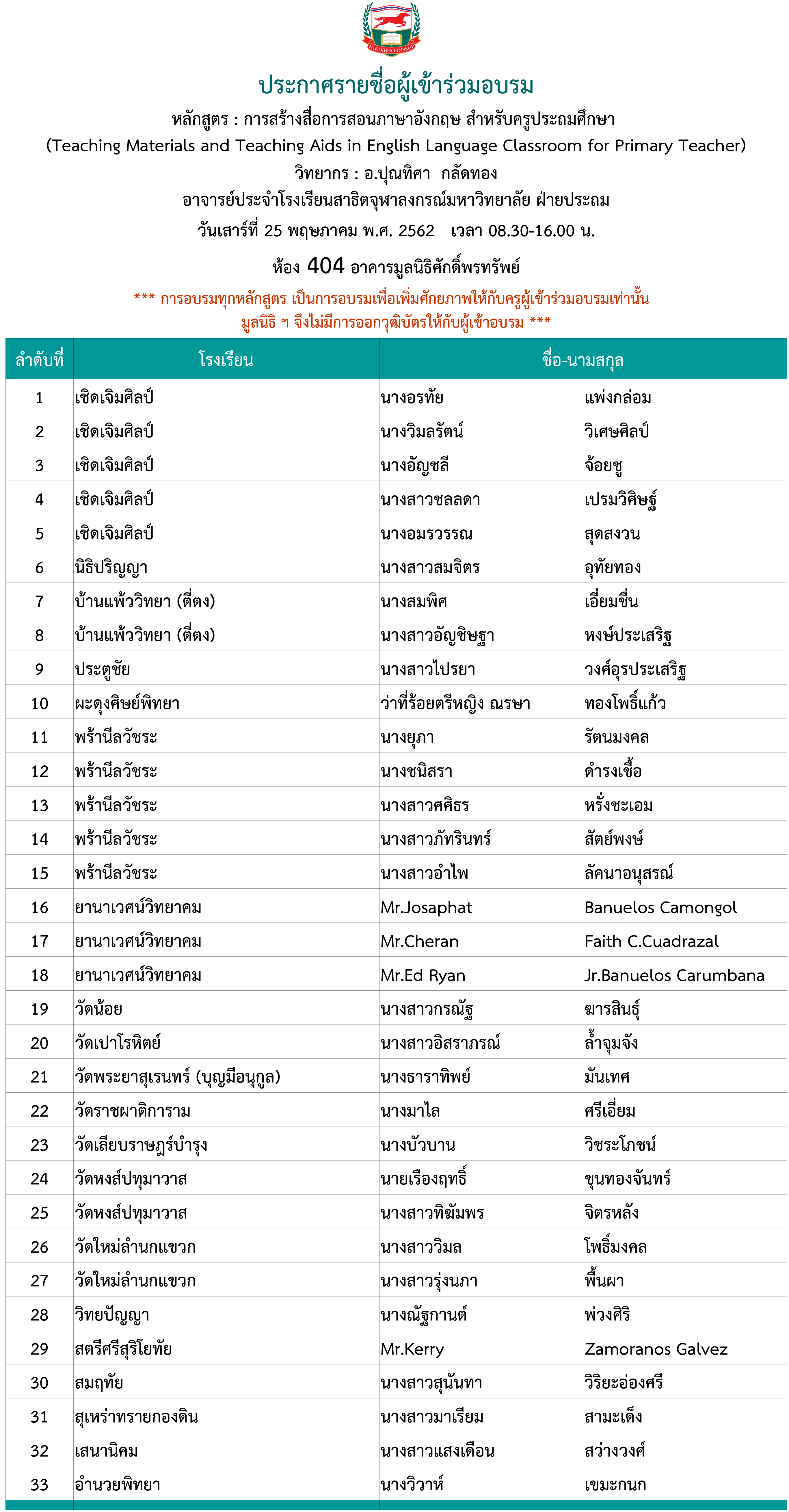 ประกาศรายชื่อ คณาจารย์ผู้เข้าร่วมอบรม วันที่ 25-26 พฤษภาคม 2562