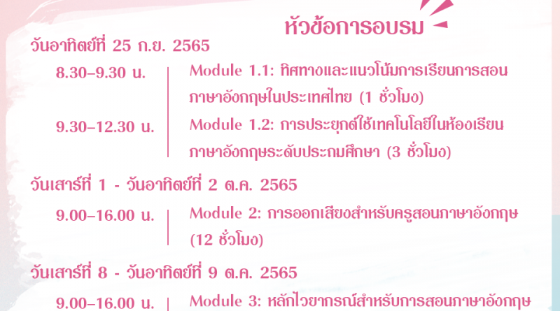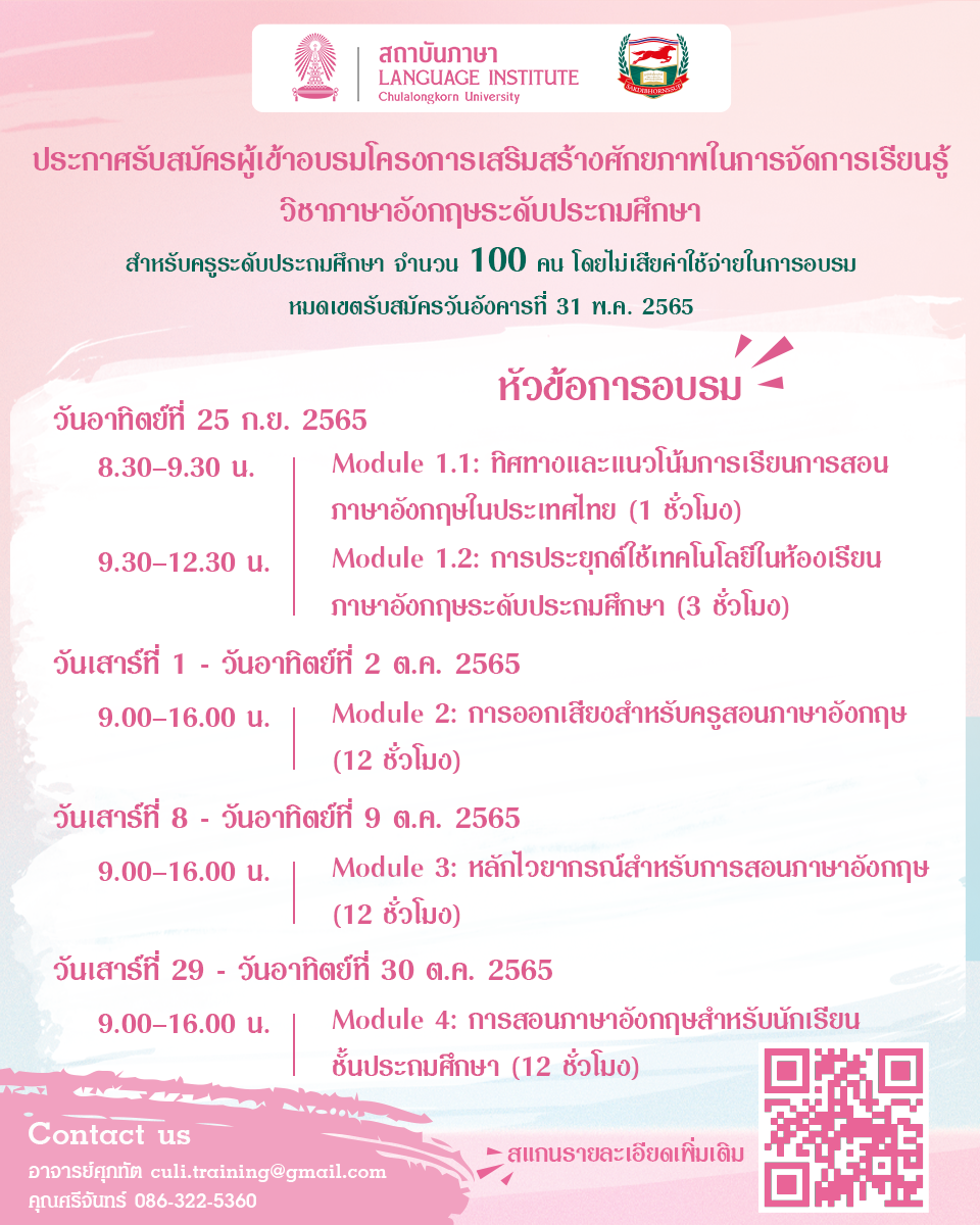 ข่าวประชาสัมพันธ์ ประชาสัมพันธ์ : โครงการเสริมสร้างศักยภาพในการจัดการเรียนรู้วิชาภาษาอังกฤษระดับประถมศึกษา April 4, 2022 kusol admin โครงการเสริมสร้างศักยภาพในการจัดการเรียนรู้วิชาภาษาอังกฤษระดับประถมศึกษา