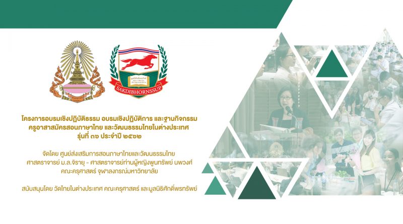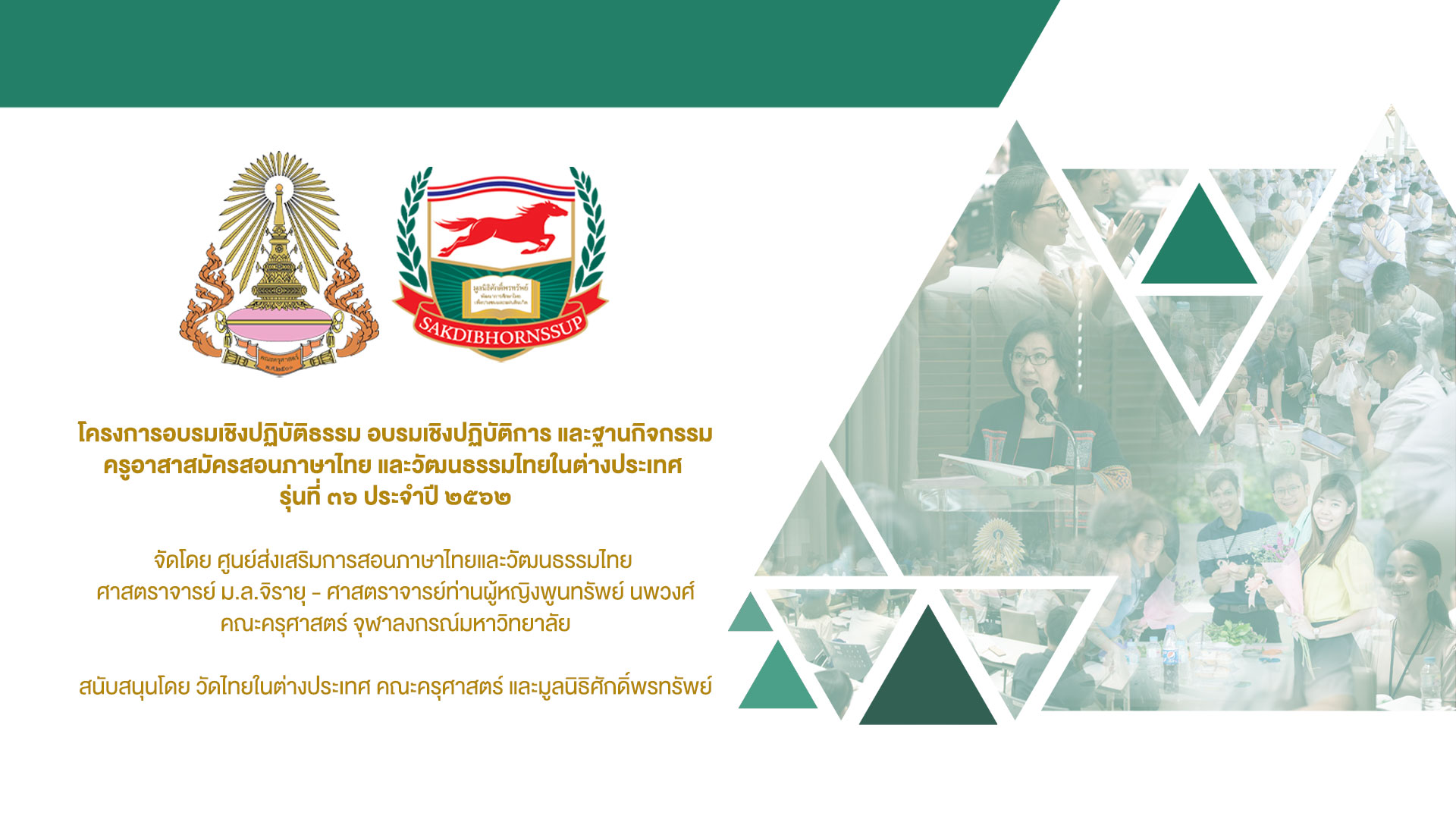 โครงการอบรมเชิงปฏิบัติธรรม อบรมเชิงปฏิบัติการและฐานกิจกรรม ครูอาสาสมัครเพื่อสอนภาษาไทยและวัฒนธรรมไทยในต่างประเทศ รุ่นที่ ๓๖ ประจำปี ๒๕๖๒ จัดโดยศูนย์ส่งเสริมการสอนภาษาไทยและวัฒนธรรมไทย ศาสตราจารย์ ม.ล.จิรายุ - ศาสตราจารย์ท่านผู้หญิงพูนทรัพย์ นพวงศ์ คณะครุศาสตร์ จุฬาลงกรณ์มหาวิทยาลัย อบรม ระหว่างวันที่ ๒๕ มีนาคม - ๒๘ เมษายน ๒๕๖๒ ณ ห้องอำไพ สุจริตกุล โรงเรียนสาธิตจุฬาลงกรณ์มหาวิทยาลัย ฝ่ายประถม คณะครุศาสตร์ จุฬาลงกรณ์มหาวิทยาลัย และต้นบุญธรรมสถาน จังหวัดชลบุรี สนับสนุนโดย มูลนิธิศักดิ์พรทรัพย์