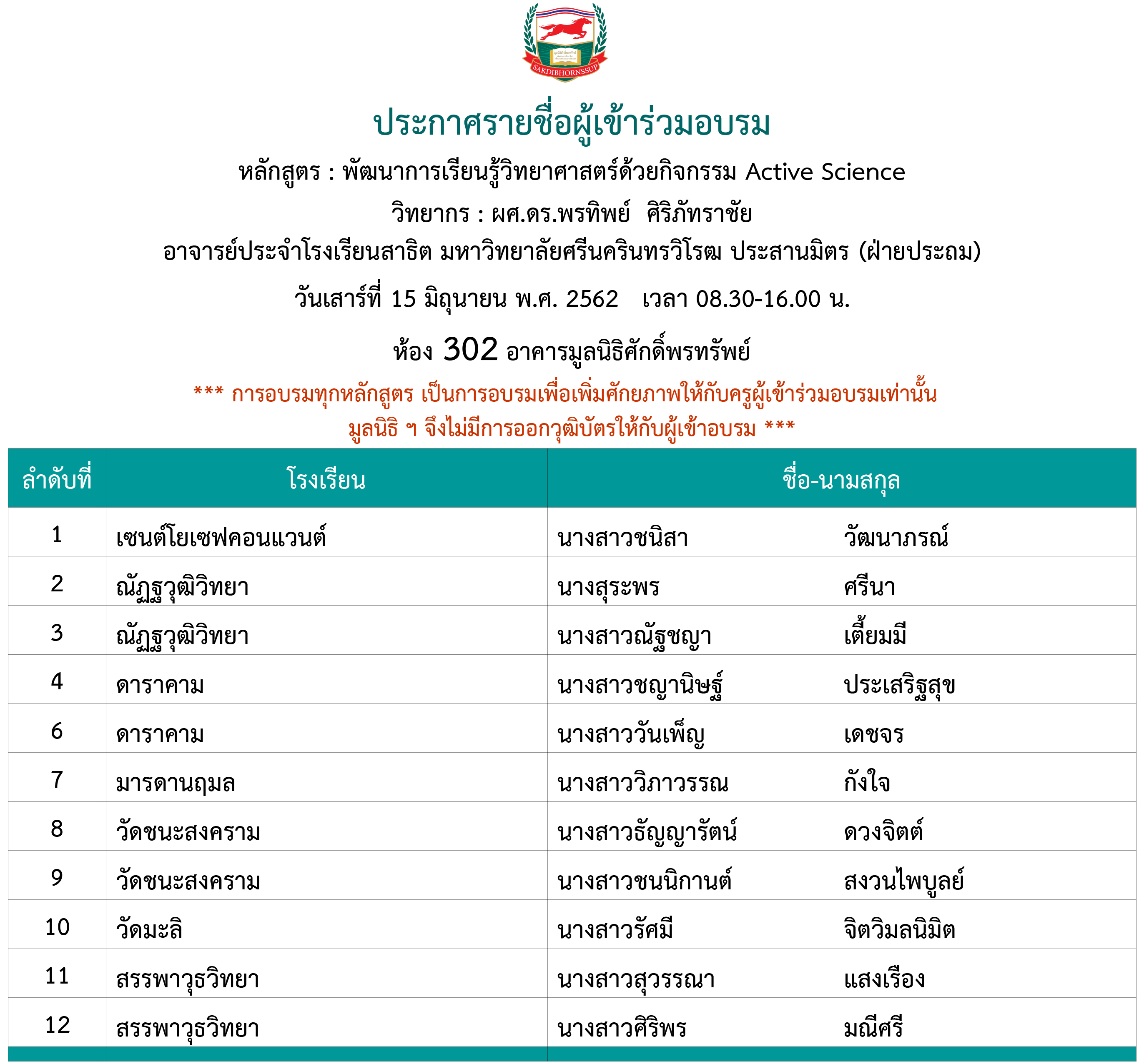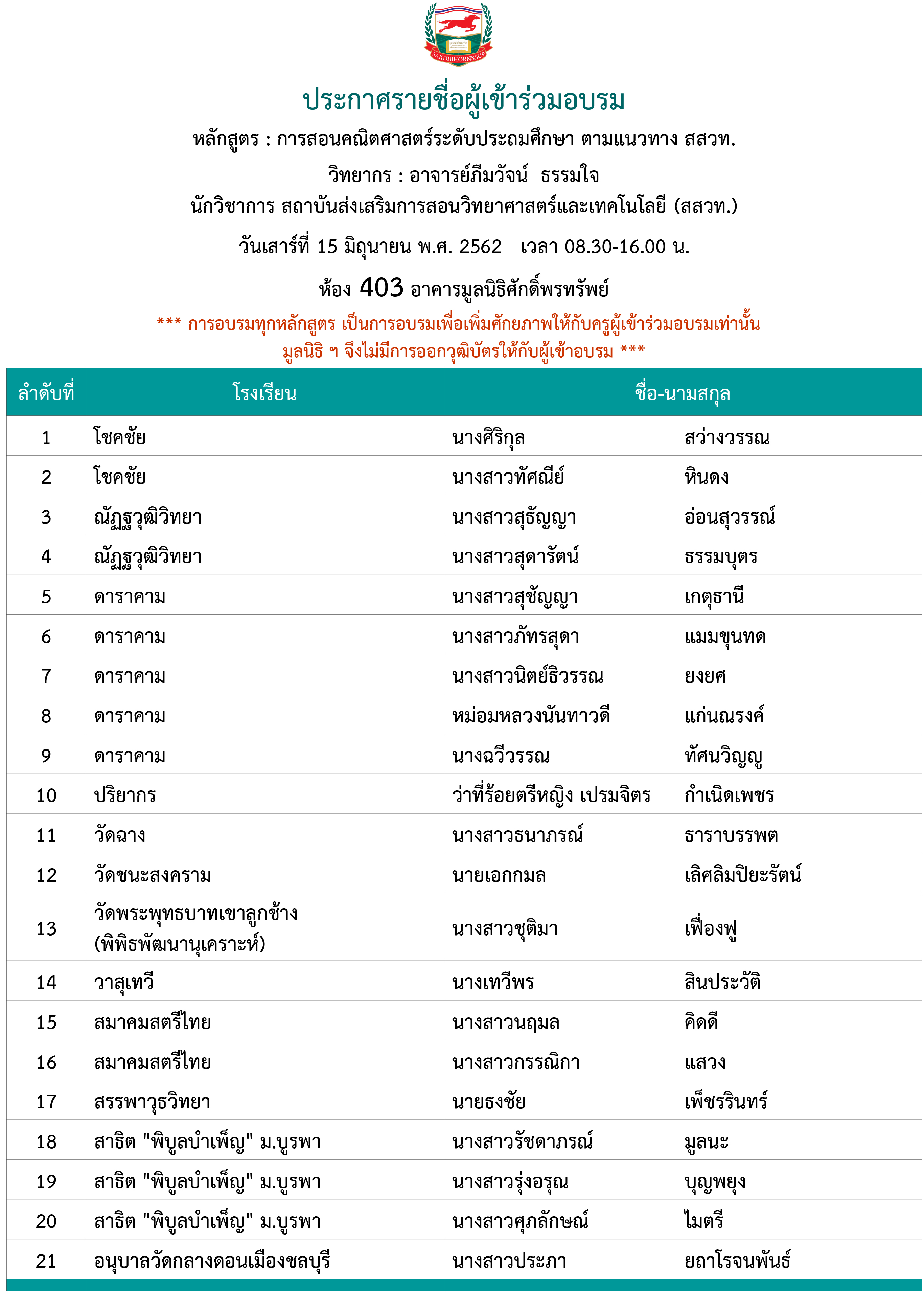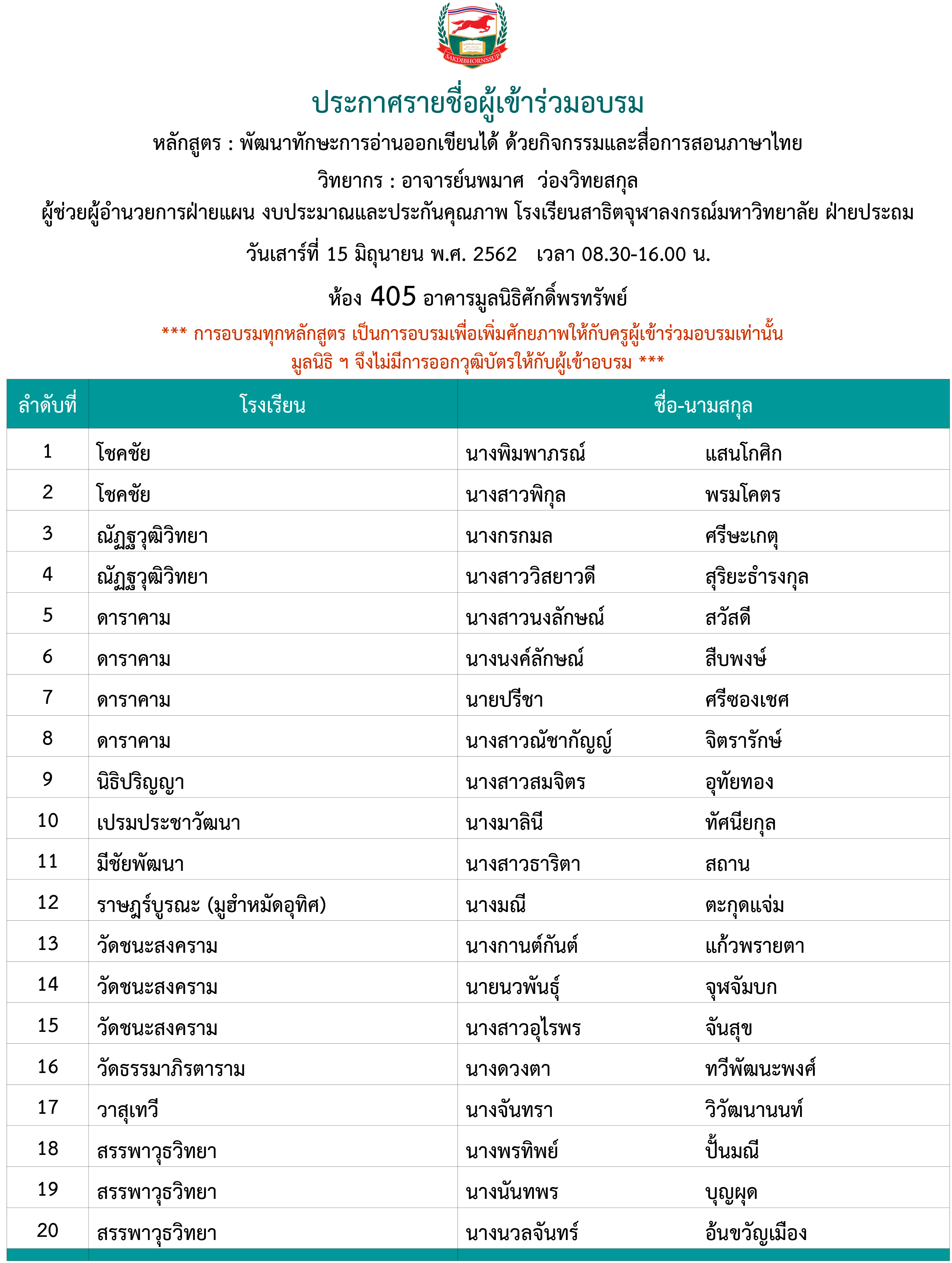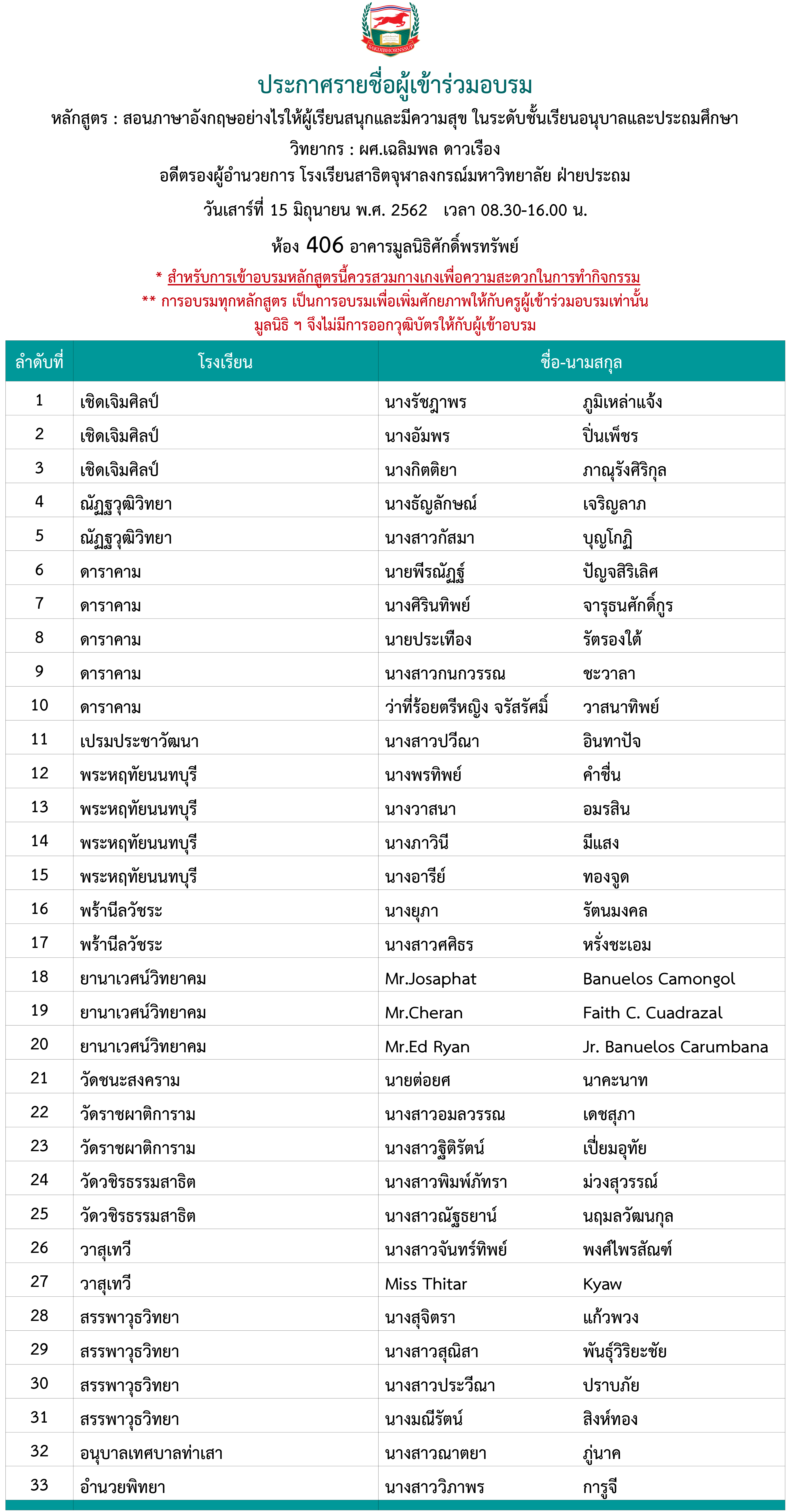 ประกาศรายชื่อ คณาจารย์ผู้เข้าร่วมอบรม วันที่ 15 มิถุนายน 2562