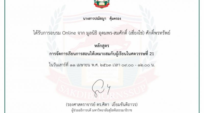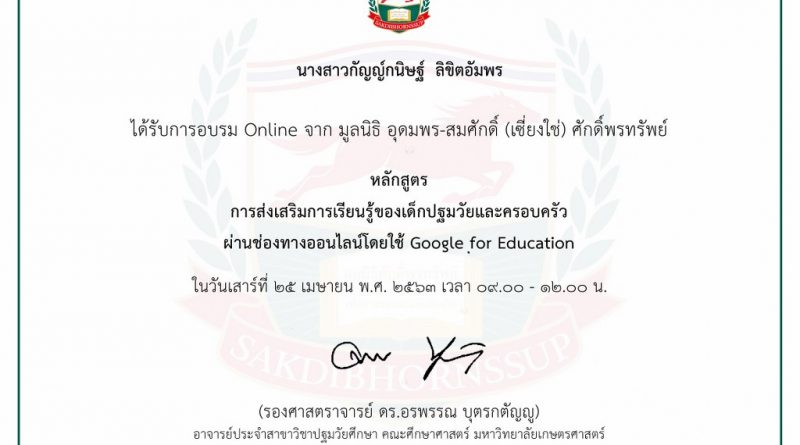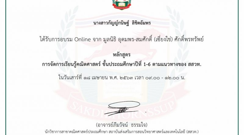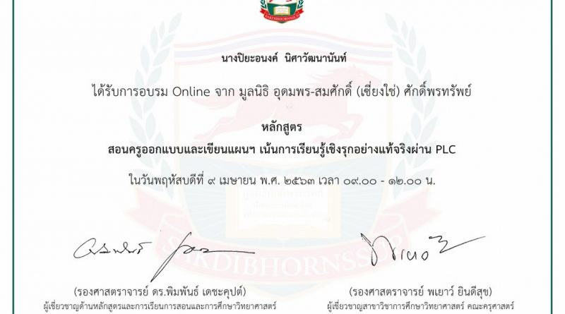 หนังสือรับรอง หลักสูตร : ไขปริศนา ธรรมชาติของเทคโนโลยีในชั้นเรียนวิทยาศาสตร์ วิทยากร : รศ.ดร.ศศิเทพ ปิติพรเทพิน วันพฤหัสบดีที่ 30 เมษายน 2563 เวลา 09.00-12.00 น.