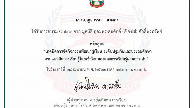 Read moreหนังสือรับรอง หลักสูตร : ของเล่นและกิจกรรมสะเต็มศึกษาผ่านนิทานแสนสนุก วิทยากร : อาจารย์ฤทัย จงสฤษดิ์ วันเสารที่ 25 เมษายน 2563 เวลา 09.00-12.00 น.