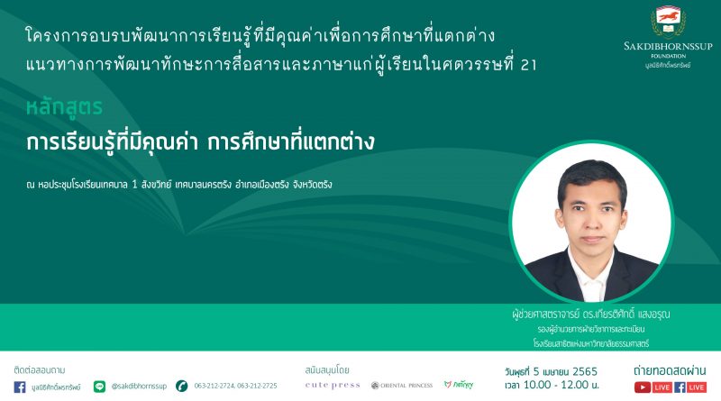 ประชาสัมพันธ์ “โครงการอบรมพัฒนาการเรียนรู้ที่มีคุณค่าเพื่อการศึกษาที่แตกต่าง แนวทางการพัฒนาทักษะการสื่อสารและภาษาแก่ผู้เรียนในศตวรรษที่ 21” ระหว่างวันที่ 5-7 เม.ย. 2566 หอประชุมโรงเรียนเทศบาล1 เทศบาลเมืองตรัง จังหวัดตรัง สามารถรับชมผ่านทาง Facebook Live : มูลนิธิศักดิ์พรทรัพย์ กำหนดการ : – วันพุธที่