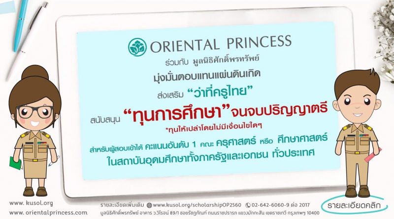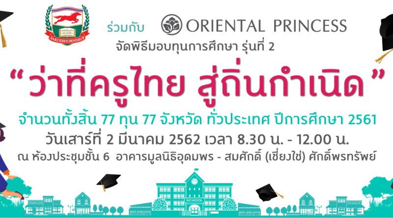มูลนิธิศักดิ์พรทรัพย์ร่วม กับ ORIENTAL PRINCESS สานต่อปณิธานในการทำความดี เพื่อตอบแทนสังคม มุ่งเน้นการพัฒนาศักยภาพด้านการศึกษา โดยการมอบทุนการศึกษา “ว่าที่ครูไทยสู่ถิ่นกำเนิด” ครั้งที่ 2 ประจำปีการศึกษา 2561 จังหวัดละ 1 ทุน รวมทั้งสิ้น 77 ทุน ทั่วประเทศ โครงการการมอบทุนการศึกษา “ว่าที่ครูไทยสู่ถิ่นกำเนิด” ครั้งที่