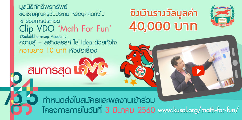 มูลนิธิศักดิ์พรทรัพย์ ขอเชิญครู-อาจารย์ระดับชั้นประถมศึกษาและบุคคลทั่วไป ส่งผลงานเข้าร่วมการประกวดคลิปวิดีโอ “Math For Fun @Sakdibhornssup Academy” ในหัวข้อ “สมการสุด LOVE” ชิงเงินรางวัลมูลค่ารวม 40,000 บาท พร้อมประกาศนียบัตร